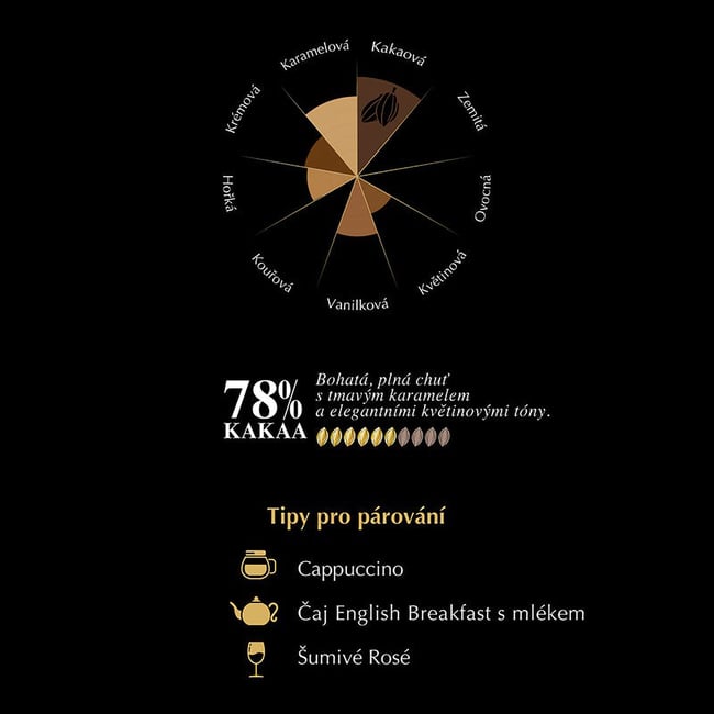Lindt Excellence 78% je vyvážená hořká čokoláda s delikátní vůní a lahodnou středně výraznou kakaovou chutí. Má intenzivní kakaové aroma s jemnými ovocnými a květinovými podtóny a lehkým dotekem přírodní vanilky.