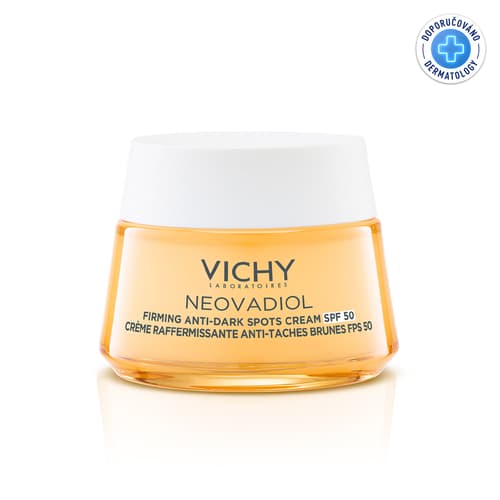 Zpevňující krém proti tmavým skvrnám s SPF 50. Koriguje tmavé skvrny, vrásky a ztrátu pevnosti pleti. Hormonální změny po menopauze oslabují přirozenou obranyschopnost pleti, která je tak zranitelnější vůči UV záření. To vede ke zhoršení známek fotostárnutí, jako jsou vrásky, tmavé skvrny a ztráta pevnosti pleti. Mimo to pleť ztrácí svůj jas a pružnost. Laboratoře Vichy vyvinuly nový Zpevňující krém Neovadiol proti tmavým skvrnám, který pleti poskytuje trojí účinek a reaguje na vaše potřeby v oblasti stařeckých skvrn, pevnosti a vrásek. Benefity: Zpevňující duo Proxylane a výtažek z kasie v kombinaci s niacinamidem a širokospektrálním UV filtrem SPF 50, s trojím účinkem proti stárnutí pleti, pomáhá korigovat a předcházet vzniku stařeckých skvrn, ztrátě pevnosti a vzniku vrásek. Testováno pod dermatologickou kontrolou. Hypoalergenní složení. Vhodný pro citlivou pleť. Textura: Nemastná, vyživující. Rychle se vstřebává. Nelepí. Balení obsahuje 50 ml.