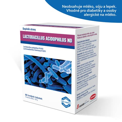 Doplněk stravy Lactobacillus acidophilus ND je ve formě tobolek s obsahem živých kultur mléčných bakterií. Přípravek obsahuje klinicky testované kmeny laktobacilů. Mléčné bakterie jsou součástí přirozené střevní mikroflóry. Rozmanité vlivy (stres, užívání antibiotik, nevhodná strava) narušují mikrobiální rovnováhu ve střevě a proto je vhodné je doplňovat. Lactobacillus acidophilus ND neobsahuje mléko, sóju ani lepek a je vhodný pro diabetiky i pro osoby alergické na mléko. Nepřekračujte doporučené denní dávkování. Uchovávejte mimo dosah dětí. Doplňky stravy nejsou náhradou pestré a vyvážené stravy. Balení obsahuje 60 tobolek (hmotnost obsahu 18,6 g).