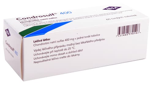 Download the information leafletLéčivou látkou je chondroitini natrii sulfas 400 mg. Pomocnými látkami jsou želatina, idigokarmín (E 132), chinolínová žluť (E 104) a magnesium-stearát (E 470 B).