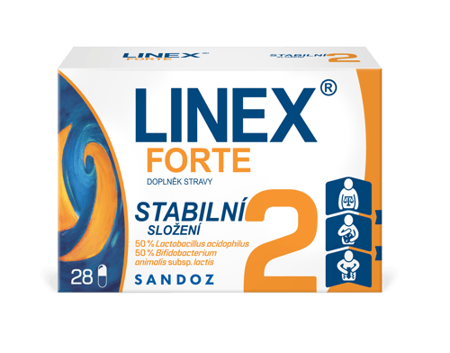 Doplněk stravy. Přípravek Linex Forte Sandoz obsahuje kombinaci 2 kmenů mléčných bakterií - Lactobacilus acidophilus a Bifidobacterium animalis subsp. lactis, které před žaludeční kyselinou chrání speciální obal - tzv. polysacharidová matrix. Tobolka se rozpouští až ve střevech. Výhodou přípravku Linex Forte je vyvážený poměr mléčných bakterií a to 50 % (Lactobacilus): 50 % (Bifidobacterium). Polysacharidová matrix pro ochranu živých mikroorganismů. Bez nutnosti uchovávat v lednici. Tobolka se rozpouští ve střevech. Výrobek mohou užívat vegetariáni. Nepřekračujte doporučené denní dávkování. Uchovávejte mimo dosah dětí. Doplňky stravy nejsou náhradou pestré stravy. Balení: 28 kapslí.