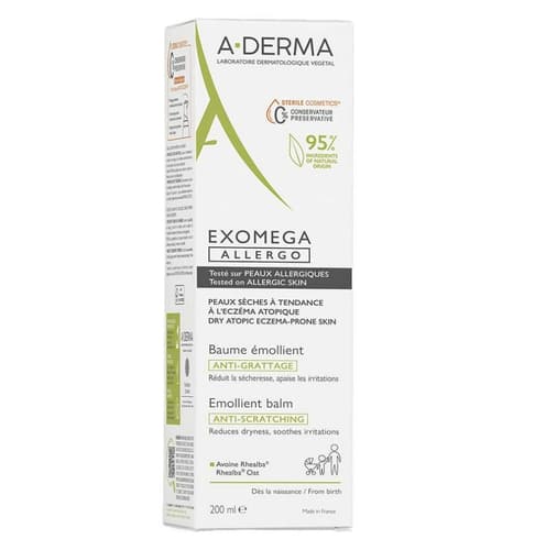 A-Derma Exomega ALLERGO Emolienční balzám okamžitě a trvale zklidňuje svědění, podráždění a zarudnutí. Vyživuje a posiluje kožní bariéru. Snižuje četnost suchých míst. Má výživnou texturu, rychle se vstřebává. Okamžitá možnost obléknout se ihned po aplikaci. Je vhodný k použití na obličej, oční víčka a tělo, a to již od narození. Testováno na alergické pokožce a na vysoce citlivých místech, jako jsou oční víčka. Balzám je bez parfemace a je vyroben ve 100% sterilním prostředí. Obsahuje 90% složek přírodního původu a 0% konzervačních látek. Vhodné pro vegany. Ekologicky odlehčený recyklovatelný plastový obal. Hlavní výhody: - sterilní složení bez konzervačních látek, - unikátní ochranné balení, - pomáhá zmírnit pocity svědění, - testováno na alergické pokožce, - okamžitě zklidňuje a kontroluje pocity podráždění spojené se suchostí kůže, - přírodní složení. Účinné látky: Extrakt z výhonků ovsa Rhealba®, získaných z organického zemědělství, posiluje a chrání kožní bariéru, BioVect® technologie - bioaktivní vektor/přenášeč pro zrychlení účinku, Filaxerine® (10 HDA, pupalkový olej) obnovuje kožní bariéru, Vitamin B3 - obnovuje kožní bariéru. Obsah balení je 200 ml.
