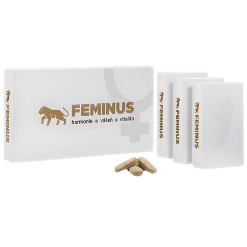 Doplněk stravy. Feminus je doplněk stravy ve formě tablet. Jedná se o unikátní přípravek pro ženy s obsahem extraktů bylin a vitaminů. Ve složení se nalézá řeřicha peruánská, indický ženšen, extrakt z kakaa, kotvičník zemní, muira puama, vitamin C, andělika čínská, damiána pravá, zinek, vitamin E, vitamin B6, vitamin D3, vitamin B12. Extrakt z kakaa je antioxidant. Řeřicha peruánská (Maca) podporuje plodnost. Indický ženšen podporuje duševní zdraví a relaxaci. Kotvičník zemní přispívá k normální činnosti pohlavních orgánů / hormonální aktivita. Muira puama je antioxidant. Vitamin C přispívá k normální funkci imunitního systému. Andělika čínská přispívá k osvěžení těla. Damiána pravá podporuje duševní pohodu - stres. Zinek přispívá k normální plodnosti a reprodukci. Vitamin E přispívá k ochraně buněk před oxidativním stresem. Vitamin B6 přispívá k normální psychické činnosti. Vitamin D přispívá k normální funkci imunitního systému. Vitamin B12 přispívá k normálnímu energetickému metabolismu. Nepřekračujte doporučené denní dávkování. Uchovávejte mimo dosah dětí. Doplňky stravy nejsou náhradou pestré a vyvážené stravy. Balení obsahuje 60 tablet.