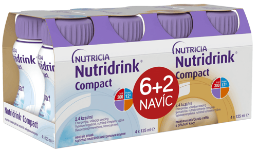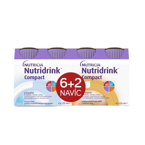 Potravina pro zvláštní lékařské účely. Nutridrink Compact je vysokoenergetická nutričně kompletní tekutá výživa. Je vhodná pro řízenou dietní výživu při podvýživě související s nemocí. Může sloužit jako částečná nebo úplná náhrada stravy pro pacienty se zvýšenou spotřebou energie a nedostatečným příjmem živin. Bez lepku. Balení obsahuje 8 lahviček po 125 ml. Balení obsahuje příchutě: 4x neutrální, 4x káva.