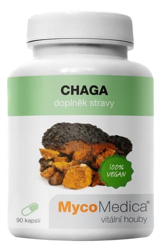 Doplněk stravy. MycoMedica Chaga je doplněk stravy ve formě kapslí. Chaga (rezavec šikmý) roste na kmenech sibiřských bříz a je oblíbená v tradiční čínské medicíně. Chaga obsahuje betulin, kyselinu betulinovou, dále stopové minerály, vlákninu, aminokyseliny a betaglukany. Díky zpracování metodou dvojité extrakce nabízíme vysoce kvalitní výtažek. Výhody: praktická forma kapslí, neobsahuje kofein, lepek, konzervační látky, barviva ani cukr. Vhodné i pro vegany. Nepřekračujte doporučené denní dávkování. Uchovávejte mimo dosah dětí. Doplňky stravy nejsou náhradou pestré a vyvážené stravy. Balení obsahuje 90 kapslí. Hmotnost obsahu: 53 g.