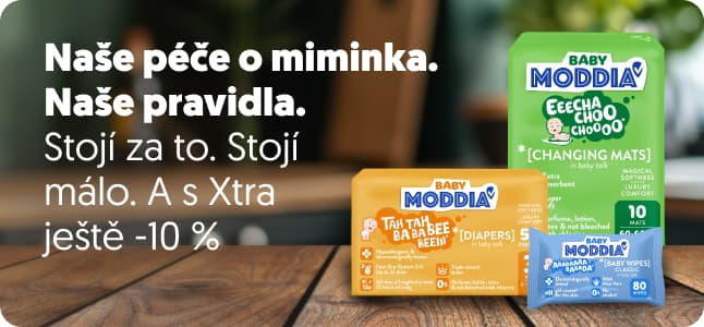 Rodičovství přináší překvapení… Některá roztomilá, jiná... méně. Proto jsme vytvořili Moddia Baby, naši vlastní značku, která se postará o ty nepořádné věci bez dramatu. Ultra savé plenky, které uzamknou vlhkost, plenkové kalhotky, které drží krok s dětmi, a biologicky rozložitelné vlhčené ubrousky, které jen nepřesouvají nepořádek, ale skutečně čistí. Hypoalergenní, dermatologicky testované a zcela bez divných chemikálií. Měkké, prodyšné, cenově dostupné a připravené pro skutečný život. Protože máte dost starostí – doslova.