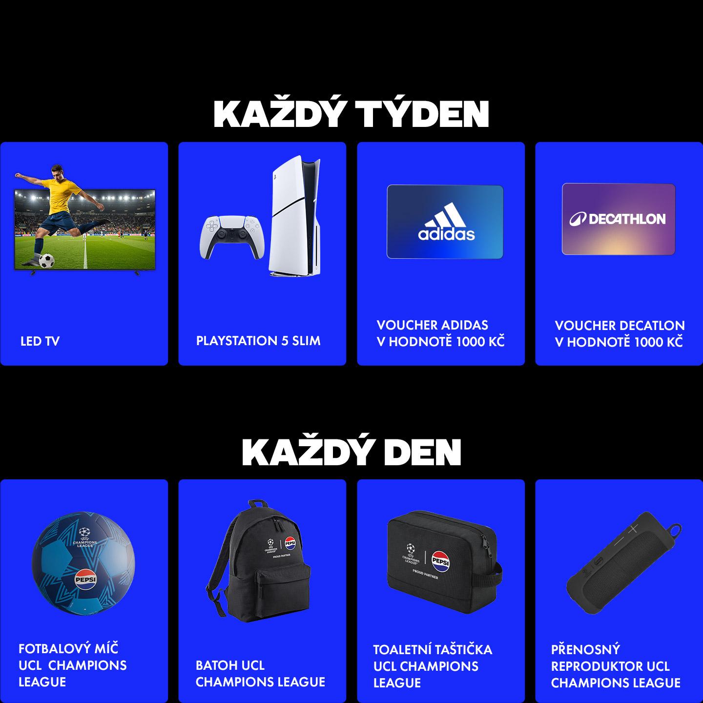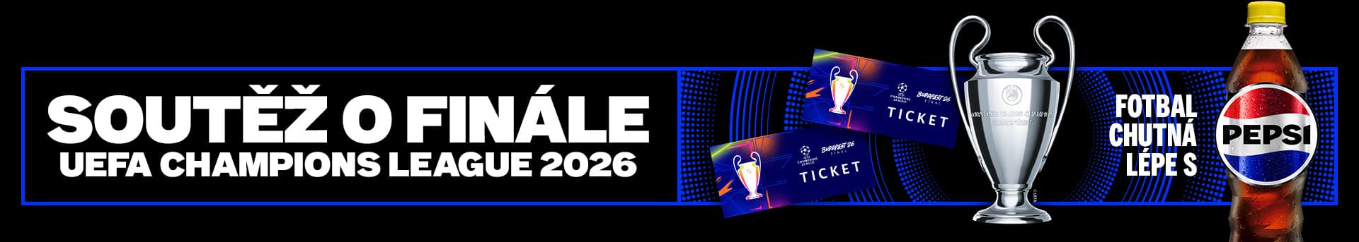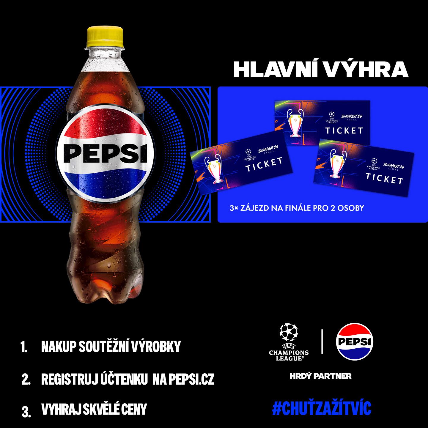 Kup produkt Pepsi, nahraj fotku účtenky a jsi automaticky ve hře o zájezd pro dvě osoby na finále UEFA Champions League v Budapešti – včetně dopravy, ubytování a vstupenek. K tomu můžeš hrát i o atraktivní týdenní ceny pro všechny milovníky fotbalu a zábavy. Stačí jeden nákup a můžeš být u toho, kde se píše fotbalová historie. Více na pepsi.cz.