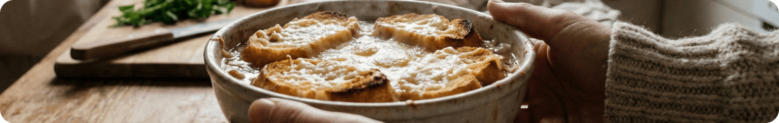 Když se ve Francii ochladí, přijde na řadu klasika. Poctivá francouzská cibulačka, která se vaří pomalu a zahřeje hned prvním soustem. Sladce karamelizovaná cibule, suché bílé víno, silný hovězí vývar a kapka demi-glace, která dodá hloubku. Navrch rozpečená bageta a sýr Gruyère, co se táhne přes celou lžíci. A k téhle hřejivé klasice se přirozeně hodí i minerální voda z francouzských hor – lehká, svěží a vyvážená. Protože komfort není jen o teple, ale i o rovnováze.
